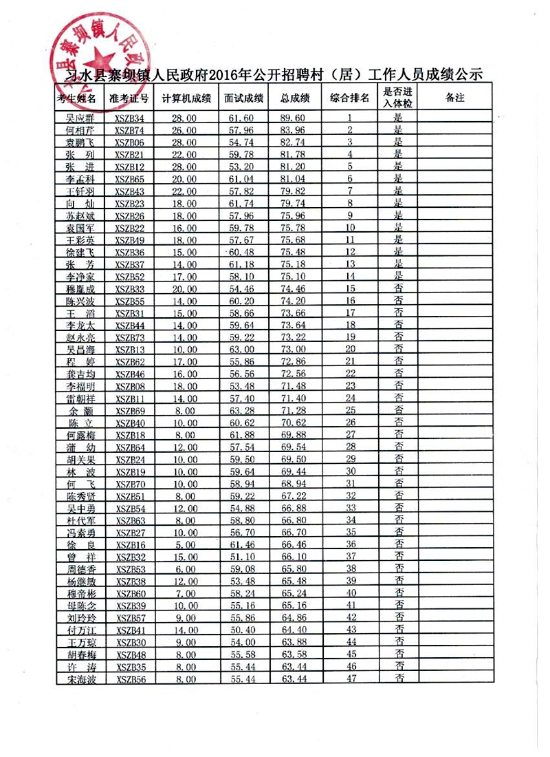 习水县寨坝镇人民政府2016年面向社会公开招聘村(居)工作人员成绩公示