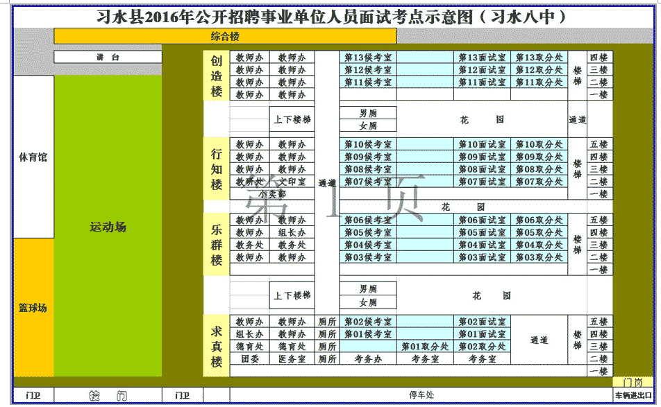 四、考场安排:本次面试共设十三间面试考场〔其中:第一至十面试考场为综合管理类(A类),第十一至十三面试考场为医疗卫生类(E类)〕,十三间候考室,十三间取分室;每间面试考场对应相应候考室、取分室。
